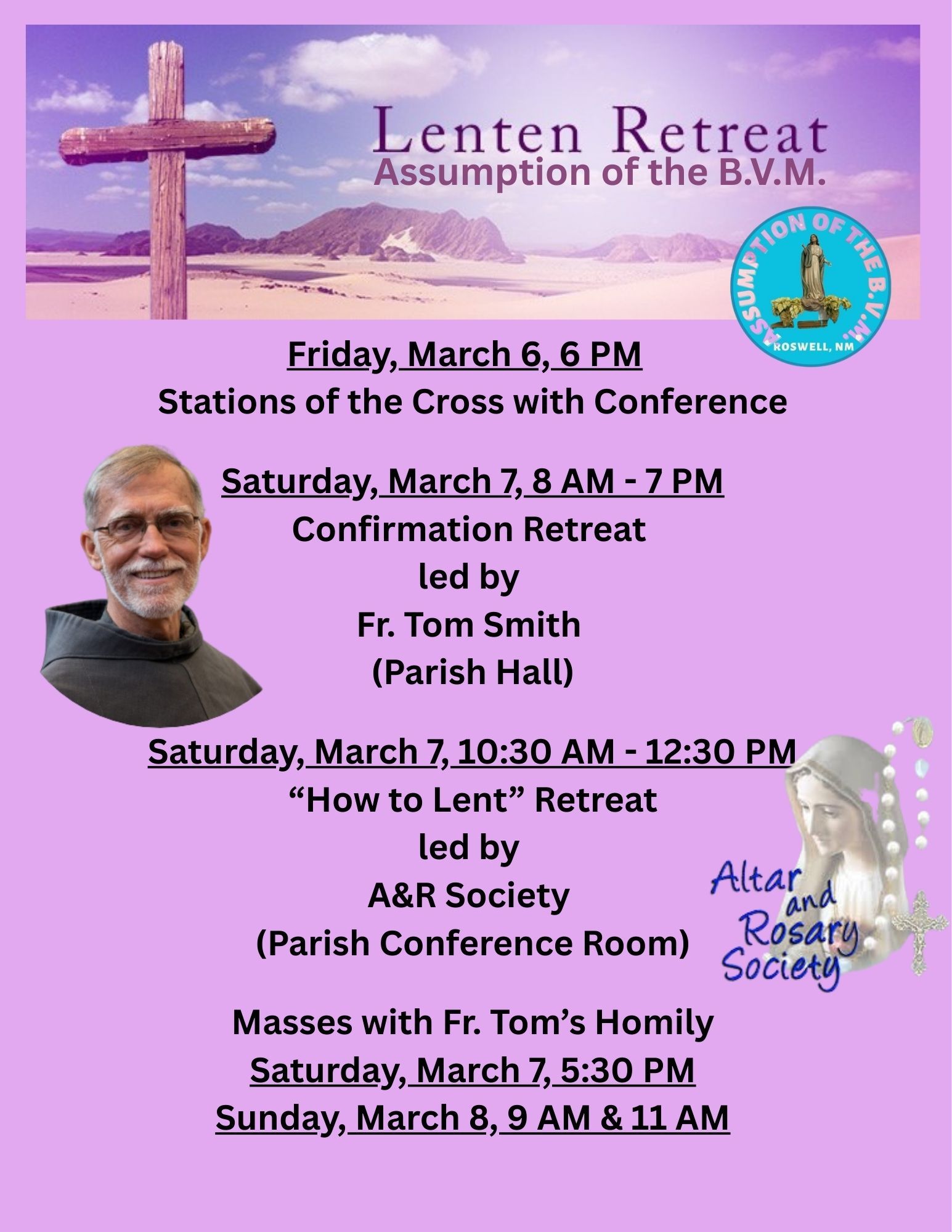 1. There will be no OCIA tomorrow/today. 2. Wednesday, February 18, is Ash Wednesday. We will have Masses at 12:10 and 6 PM, and there will be an Ash Wednesday Ecumenical Service at NMMI at 3 PM. 3. On Ash Wednesday, we will have the collection for the Aid to the Church in Central and Eastern Europe, which provides assistance to meet the needs for rebuilding the Church in Eastern Europe. It usually focuses on training seminarians and lay leaders, supporting social service programs, youth ministry, pastoral and catechetical centers, schools, church construction and renovation, evangelization and uniting the Diocese and Universal Church by collective outreach. Thank you for your donations. 4. There are no faith formation classes on Ash Wednesday. Instead, students and their families are encouraged to attend the Mass. 5. Every Friday during Lent, we will have two Stations of the Cross: after 12:10 PM Mass and at 6 PM. We will not have a homily on Fridays so that those who attend Mass during lunchtime can participate in the Stations of the Cross. 6. The marriage group will begin meeting on the first Monday of every month on March 2, from 6 to 7 PM, in the conference room. If you are interested in joining us and would like more information, please call the parish office. 7. Good Sam’s needs donations of new or clean, slightly used blankets. They are located at St. Peter’s and open Monday through Thursday from 9 to 11 AM. They also need volunteers. Please call them if you’d like to help. 8. The Altar and Rosary Society of Assumption Parish warmly invites all parishioners to join them for the Lenten Retreat on Saturday, March 7, from 10:30 a.m. to 12:30 p.m. Together, we will view the inspiring video series “How to Lent” and share in meaningful discussion and fellowship, along with light refreshments. We hope you will join us for this special time of reflection and community. If you plan to attend, please call the Parish Office with your name and the number of guests who will be coming with you.