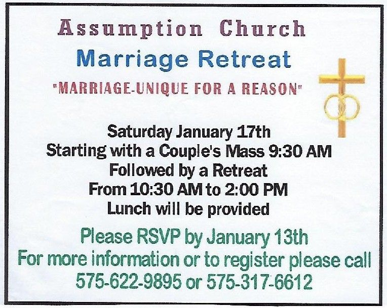 1. There will be no reconciliation or Mass on Tuesday, December 30, due to the Bishop’s Christmas Gathering for Priests in Artesia. 2. The Solemnity of Mary, Mother of God, is on January 1. It is a Holy Day of Obligation, and we will have three Masses. On the 31 st , we will have a Vigil Mass at 6 PM that will be celebrated as a thanksgiving for all gifts that were received from God this past year, and also for Assumption donors. On the 1 st , we will have Masses at 9 and 11 AM. 3. The parish office will be closed on New Year’s Day. 4. The United in Ministry campaign officially ends on December 31. However, there is a grace period of ten days until January 10. Gifts received after that date will count towards 2026. All checks must be dated no later than December 31. Credit card gifts given directly to the diocese have a hard deadline of December 31. Thank you for your generosity. 5. Next Sunday, we celebrate the Epiphany, also known as “Three Kings Day”. Each year, we have blessed chalk available at the Masses, used for marking the doorposts of our homes with an inscription of the new year separated by C+M+B. 6. The Marriage Group will resume sessions in the new year, starting with a Marriage Retreat on January 17. It will be a time to strengthen your bond, meet other couples, and give your marriage the gift of focus. The deadline to register for the retreat is January 13. Please see the poster or call the office for more information.