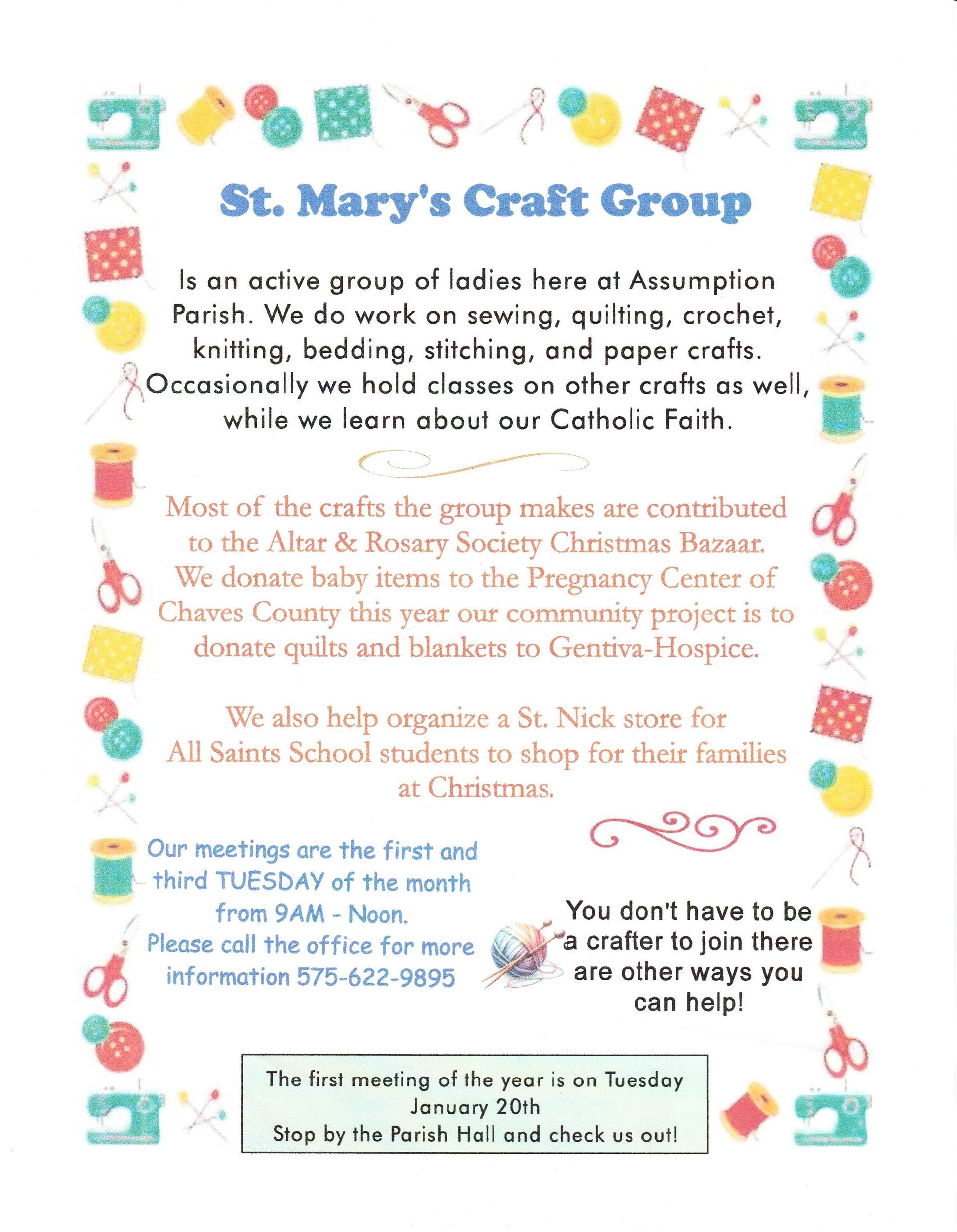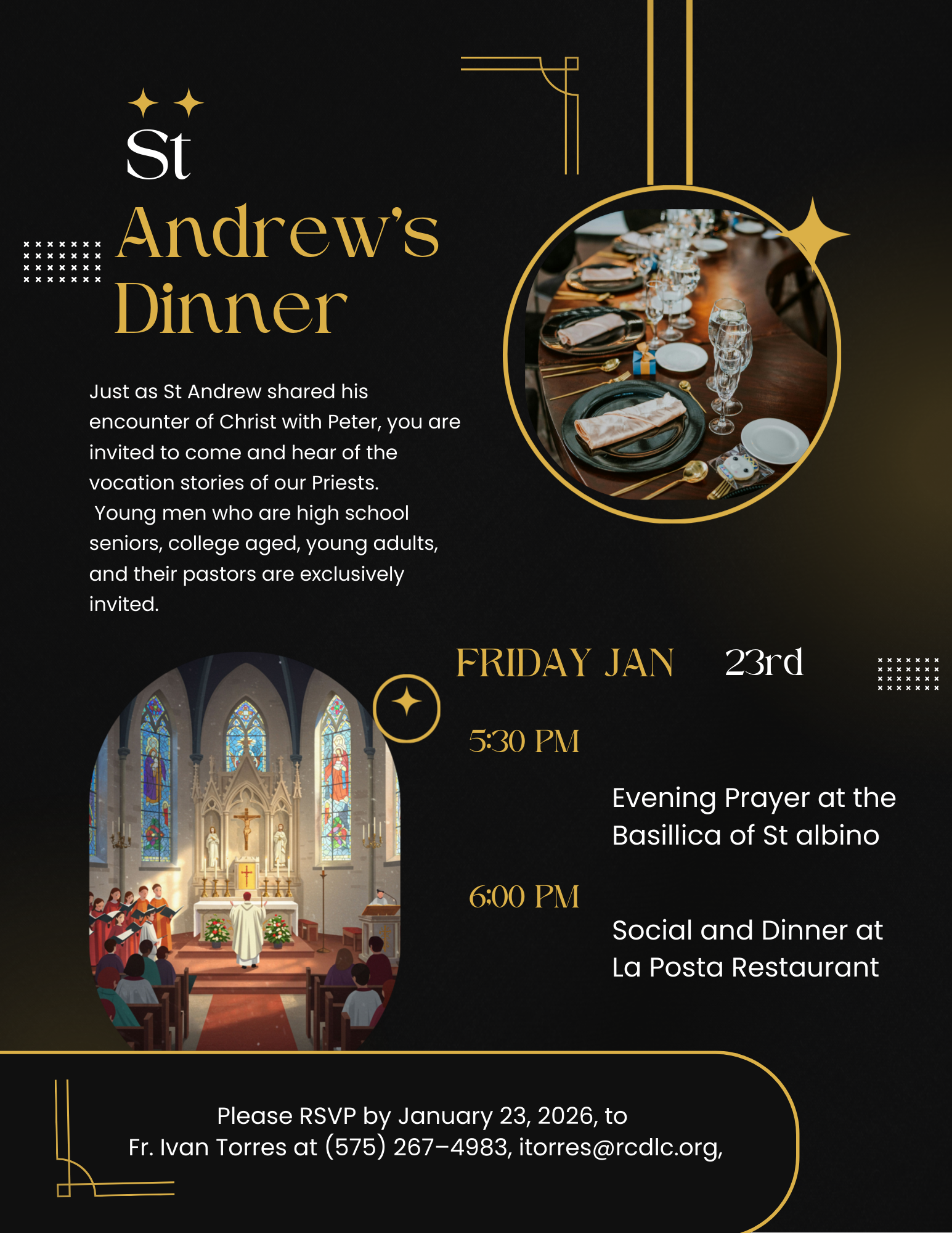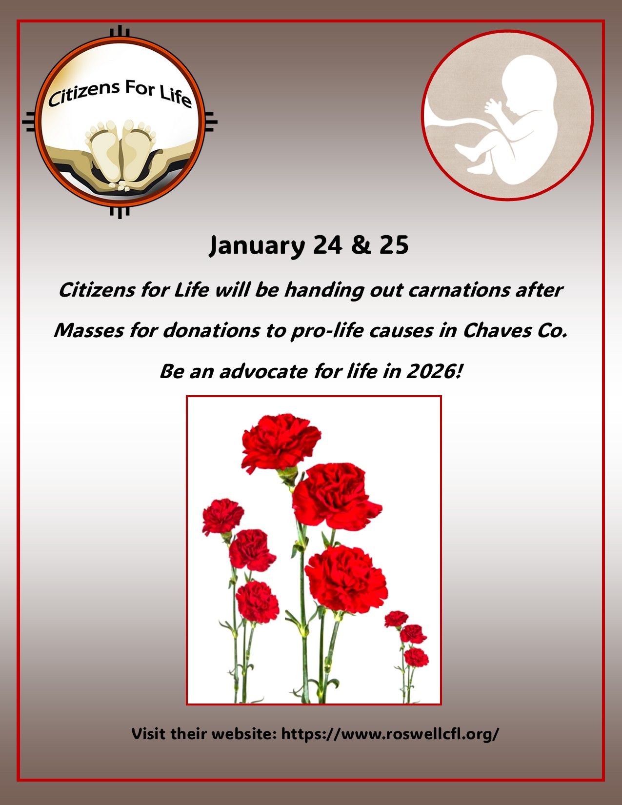1. Thank you to everyone who filled out the new registration forms. It is the last chance for parishioners to fill out the new form and bring it to the office. Please do this now because if we don’t have your form, we will remove your family from our parish database. 2. The St. Mary’s Craft Group will begin meeting for the new year this Tuesday, January 20. They meet from 9 to noon in the parish hall every first and third Tuesday. Please see the flyer in the bulletin for more information on the type of projects they do. 3. The Diocese will be holding a St. Andrew’s Dinner in Las Cruces on Friday, January 23, for young men who are high school age and older and their pastors. Please see the flyers posted on the bulletin boards, the website, and Facebook for more information. 4. Next weekend, Citizens for Life will be handing out carnations after Masses for donations to pro-life causes in Chaves County. 5. All Saints Catholic School’s Annual Mardi Gras Gala dance and dinner benefit will be at the St. Peter Church Gym on Saturday, February 7, from 6:30 to 11 pm. Tickets and tables are available for purchase at the school. 6. All couples married in the Catholic Church celebrating their Paper (1st), Silver (25th), Gold (50th) or 50 plus wedding anniversary in 2026, are invited to attend a Mass at St. Peter’s Parish in Roswell on Friday, February 13, at 5:30 pm., or at the Cathedral of Immaculate Heart of Mary in Las Cruces on Saturday, February 14, at 5:30 p.m., to celebrate and receive a blessing from Bishop Peter Baldacchino. Couples wishing to celebrate these milestone anniversaries only must register with their Parish Priest no later than January 31 and provide him with a Certificate of Marriage from the Catholic parish where the Sacrament of Holy Matrimony was celebrated, or a recent Baptism Certificate (within the last 6 months) with notations on the back of the Certificate indicating the marriage is recognized by the Church. 7. Next weekend, we will have the second collection for Las Cruces Diocese Catholic Schools, which promote excellence in education and foster Christian, spiritual, intellectual, and moral virtues in our students. Currently, the Diocese has four schools located in Roswell, Hobbs, Alamogordo, and Las Cruces. Funds from this collection will help support and expand the availability of high-quality, Catholic education within our diocese. Thank you for your donations.
