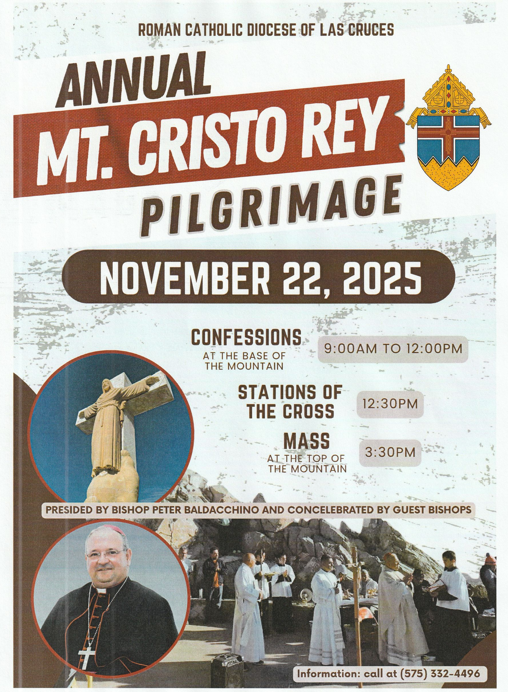1. We are upgrading our parish data of registered parishioners. Please remember to register or re-register your family. The new registration form is available in the back of the church and on the parish website. 2. The Altar & Rosary annual Bazaar and Bake Sale will continue tomorrow/today from 9 AM to 1 PM. They still have raffle tickets available; the raffle will take place at 1 PM. Stop by and enjoy a cup of coffee or tea and have your picture taken with St. Nick. 3. Tomorrow/today will be the last NMMI Mass until January 11. 4. For everyone interested in joining the pilgrimage organized by Fr. Patrick, there will be a meeting on November 20 at 6:30 PM in St. Peter’s community room. 5. The annual Mt. Cristo Rey Pilgrimage is scheduled for Saturday, November 22, in Sunland Park, NM. Please see the flyer for more information.