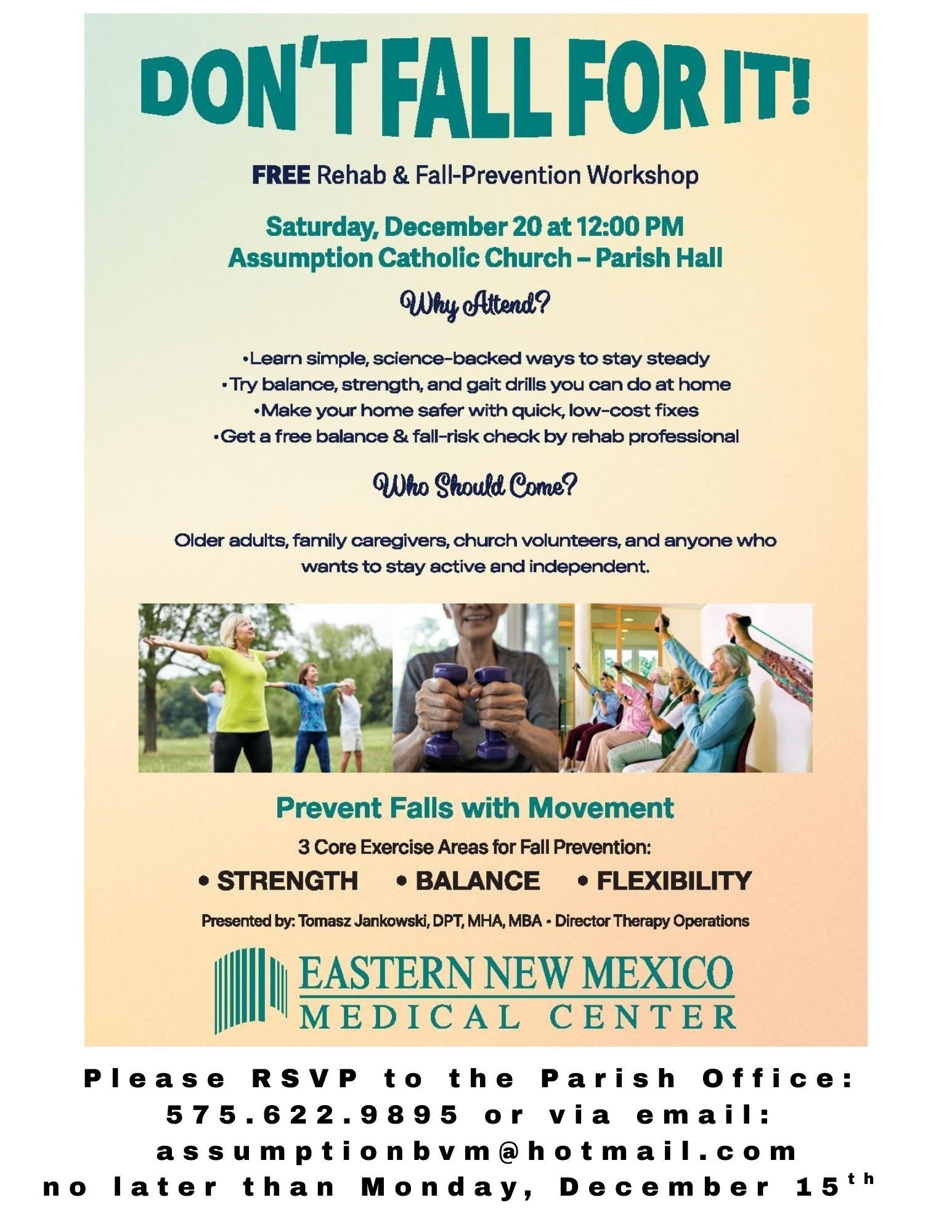 1. The ushers will now take the second collection for the Diocese of Las Cruces Retirement Fund for Religious. Thank you for your donations. 2. Please remember to register or re-register your family. 3. We are in need of lectors, especially for 5:30 PM and 11 AM Masses. If you are interested in volunteering, please call or come to the parish office for more information. 4. December 8 is the Feast Day of the Immaculate Conception of the Blessed Virgin Mary, and it is a holy day of obligation. We will have two Masses, at 12:10 and 6 PM. 5. On Saturday, December 13, from 10:30 to noon, we will have the Altar Server Christmas party. If you are an altar server and plan to attend, please RSVP to the parish office by Monday, December 8. 6. On Saturday, December 20, at noon, we will have a Rehab & Fall-Prevention Workshop with Tomasz Jankowski, Director of Therapy Operations at Eastern New Mexico Medical Center. Please RSVP by Monday, December 15. See the poster for more information. 7. Now I would like to invite Paul from Vitalant to come to the ambo to give an announcement about the upcoming blood drive. The Blood Drive is on Wednesday, December 10, from 10 AM to 2 PM. See the poster above for information on how to sign up. 8. Now, Parish Council members will share important information with us. (Parish Council members spoke about our 20% shortfall in meeting the parish ’ s monetary needs.)